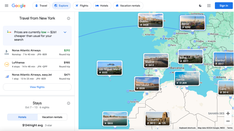 Here's an example from Google Flights. We entered New York as the departing point and hovered over Europe, and the search engine suggested a round-trip flight to Berlin for a week in October for $292, which is cheaper than usual.