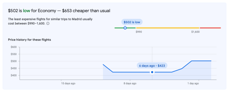 In this case, the flight we’ve chosen usually costs $653 more, so right now could be a great time to buy this flight to Europe. That said, several days before our search, the same flight was even less expensive. Theoretically, it could drop in price again.