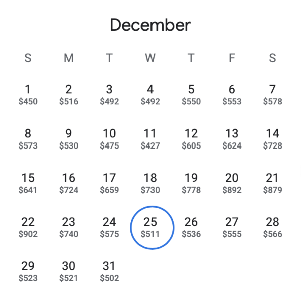 Few travelers want to spend a holiday on a plane. Most prefer to fly before or after, therefore traveling on the actual holiday itself will save you the most money. Let’s take a look at the flights from New York to Madrid again. Thanksgiving Day or Christmas Day departures cost less than the days before or after, so pick those to save on airfare.