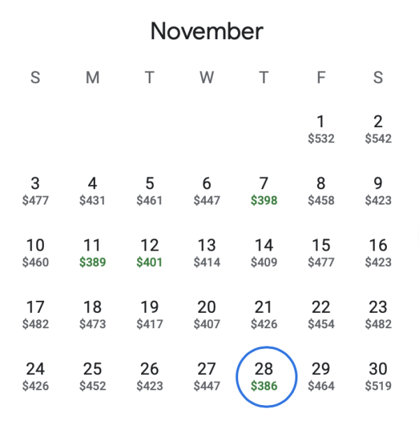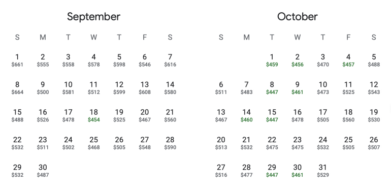 Simply enter your departure and destination cities and click on the calendar, but instead of picking a random date, scroll through the calendar and search for the dates displayed in green. These are going to be the most optimal prices at the time of your search.