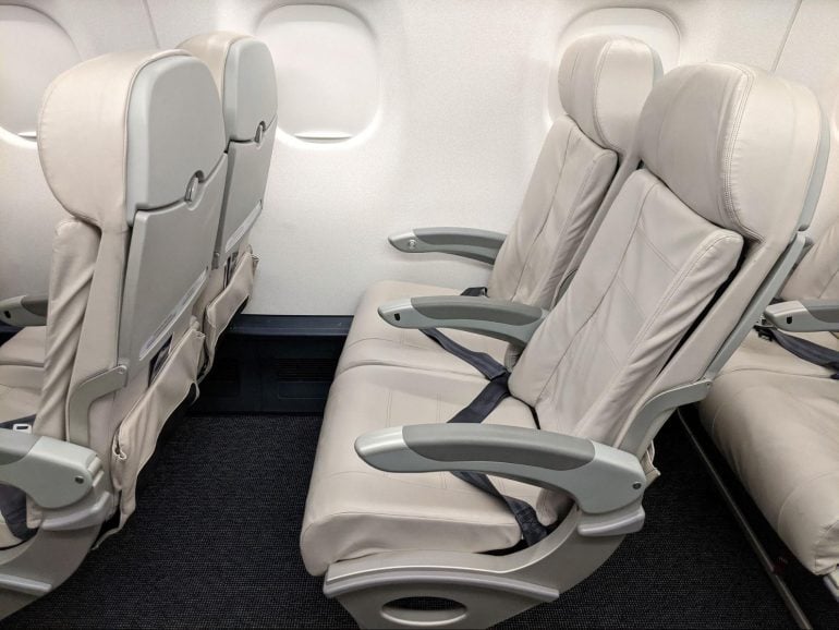 Further back, Breeze installed 10 extra-legroom seats and 80 standard-legroom seats. These rows are arranged with two seats on one side and three seats on the other. That means that — unlike on Breeze Airways Embraer aircraft — you'll need to watch out for middle seats. However, there are just 18 middle seats on each aircraft.