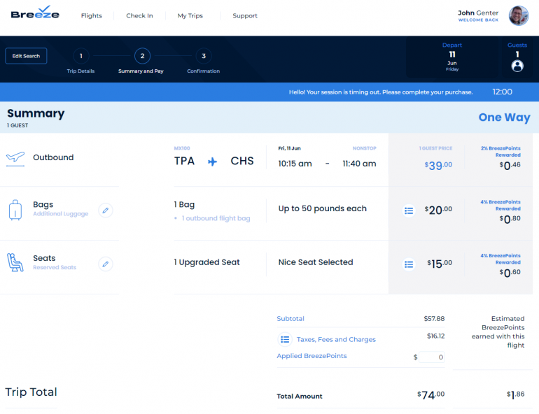 Breeze Airways requires that travelers create a BreezePoints profile to purchase a ticket, automatically enrolling flyers in the airline's reward program. Breeze travelers earn credit toward future travel in the form of BreezePoints.