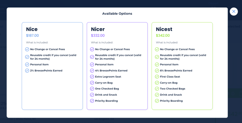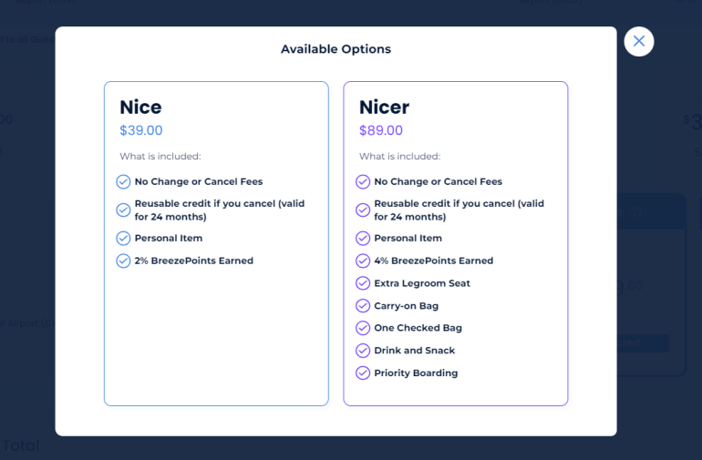 Breeze's cheapest fares, called Nice, are equivalent to basic economy on United or flights on Spirit, Frontier or Allegiant. You'll be able to bring a personal item onboard with you, but you'll need to pay for anything more than that.