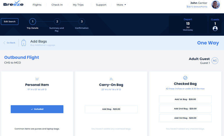 However, the bag fees for Nice fares are, well, nice. On short routes, Breeze Airways charges a flat fee of $20 per bag, regardless of route or whether you check the bag or plan to carry it on: