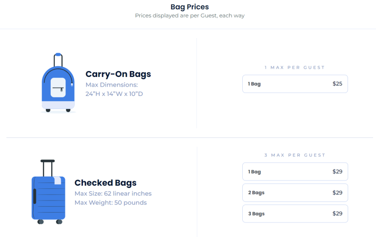 Nicer and Nicest fares include a carry-on bag and a checked bag — plus a lot more. Depending on what other add-ons you value, it may be worth paying for the Nicer fare to get extra legroom, priority boarding, bags and more.