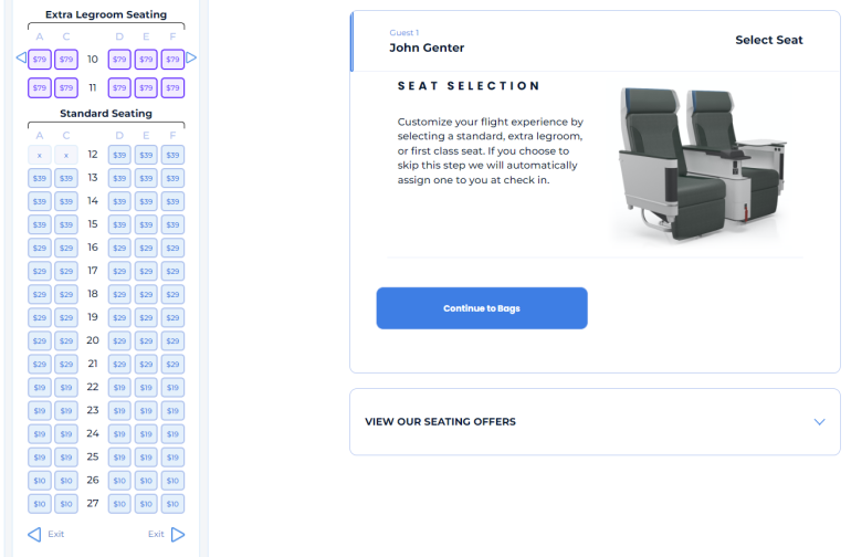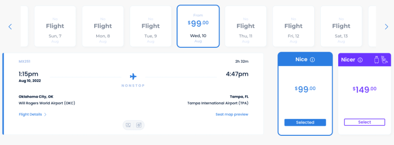If you book the cheapest Nice fare, you won't be able to select your seat for free — it costs $10 to $39 per person to choose a standard-legroom seat. Since there are no middle seats on the Embraer jets, you won’t have to pay to reserve a seat simply to avoid getting stuck in the middle. However, Breeze's new A220 aircraft do have middle seats. So, you may want to pay to reserve a seat.