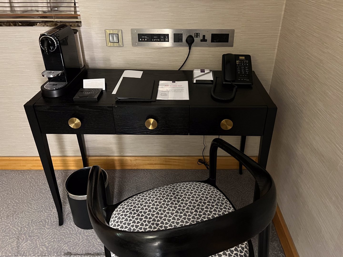 The main floor desk had several electrical outlets, including a USB and an HDMI port, an audio and video outlet, and a U.S.-compliant option (in case you forget your plug adapter.) There was a Nespresso machine and chocolates on the desk, too.