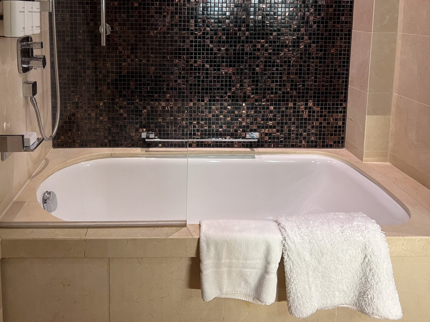 Because of my Diamond status level, I was upgraded to a lovely one-bedroom Deluxe Suite. The room had two floors, with a living room area on the main floor, and the bedroom, bathroom, shower, and bathtub upstairs.