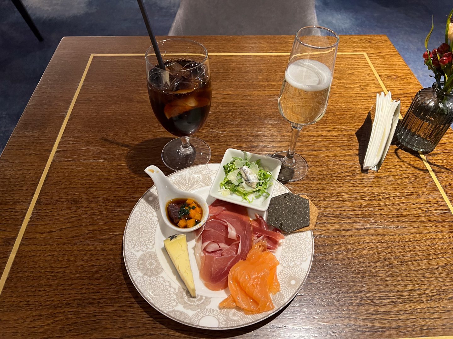 I arrived at the hotel around 2 p.m., and since my room wasn’t ready yet, I went to the lounge for some sustenance. It was fairly empty at that time, with about 10 people in it. I spent an hour snacking on a variety of sweet and savory treats, along with a Diet Coke and Champagne.