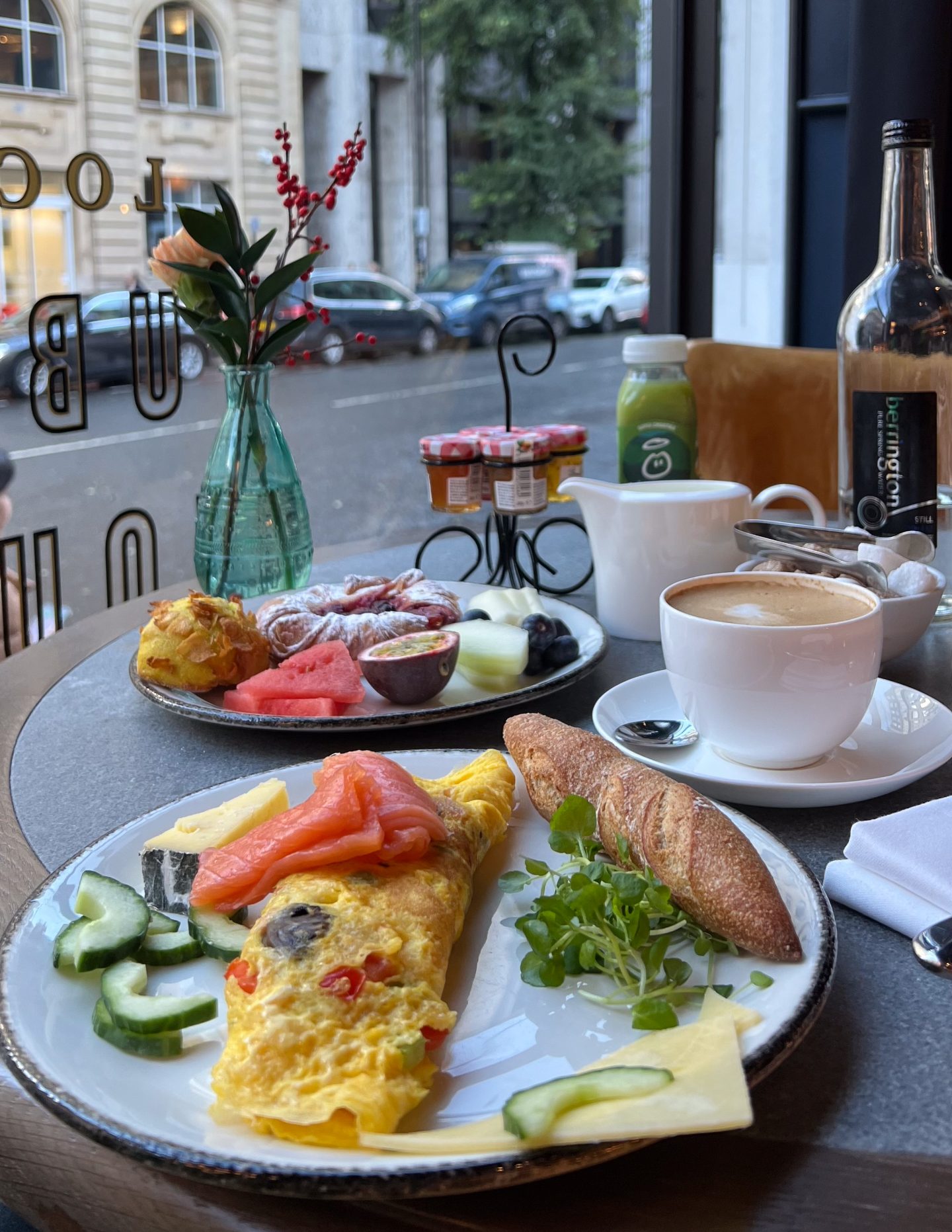 I ordered an omelet with tomatoes and peppers, and took various cheeses and veggies. I also had smoked salmon, bread, pastries and fruit. I drank a tasty homemade orange juice and a skim latte and took a green juice to go.