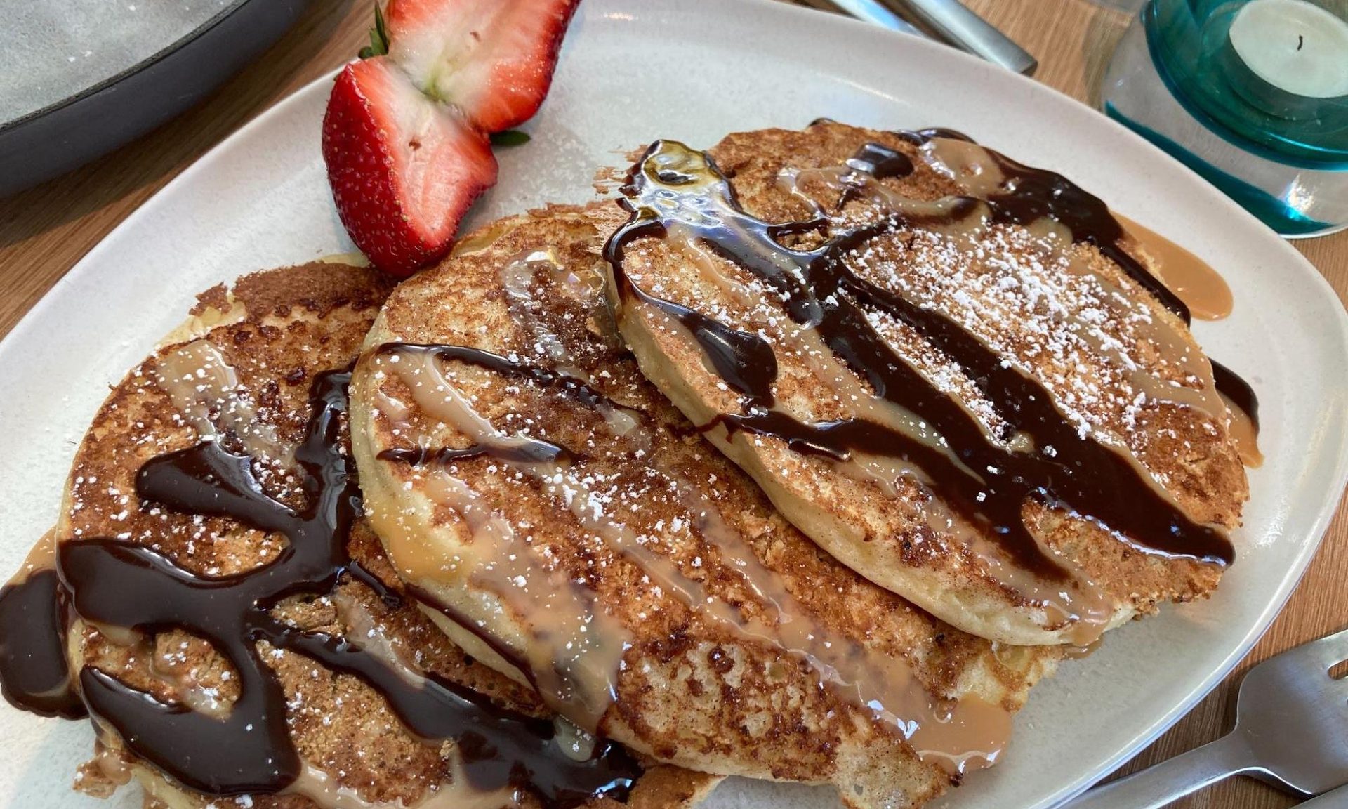 The menu’s star is the churro pancakes, which are infused with cinnamon and sugar, then covered in dulche de leche, dark chocolate sauce and churro crumble.