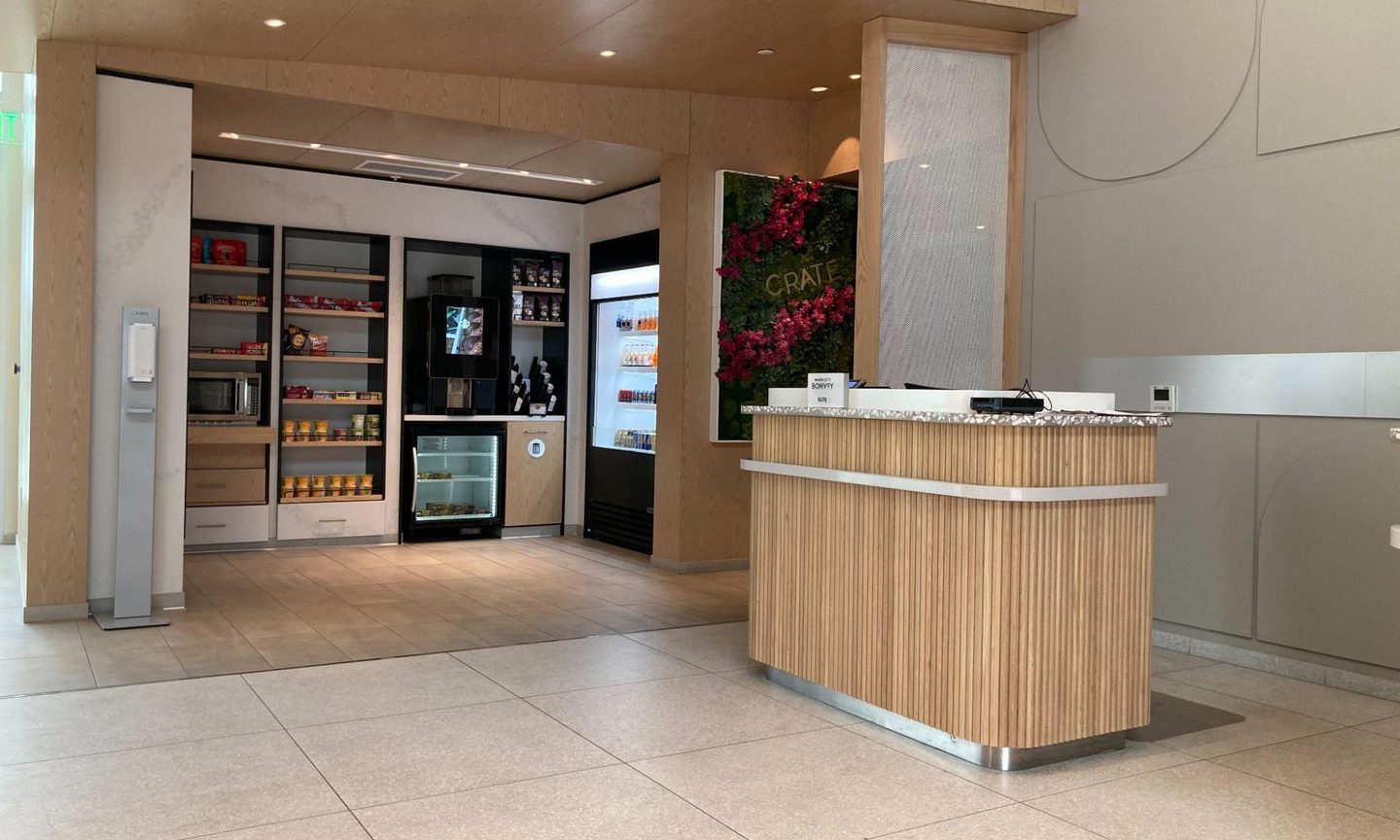 The hotel’s spacious lobby has couches and desks for relaxing and working, and just past the check-in desk is a grab-and-go market.