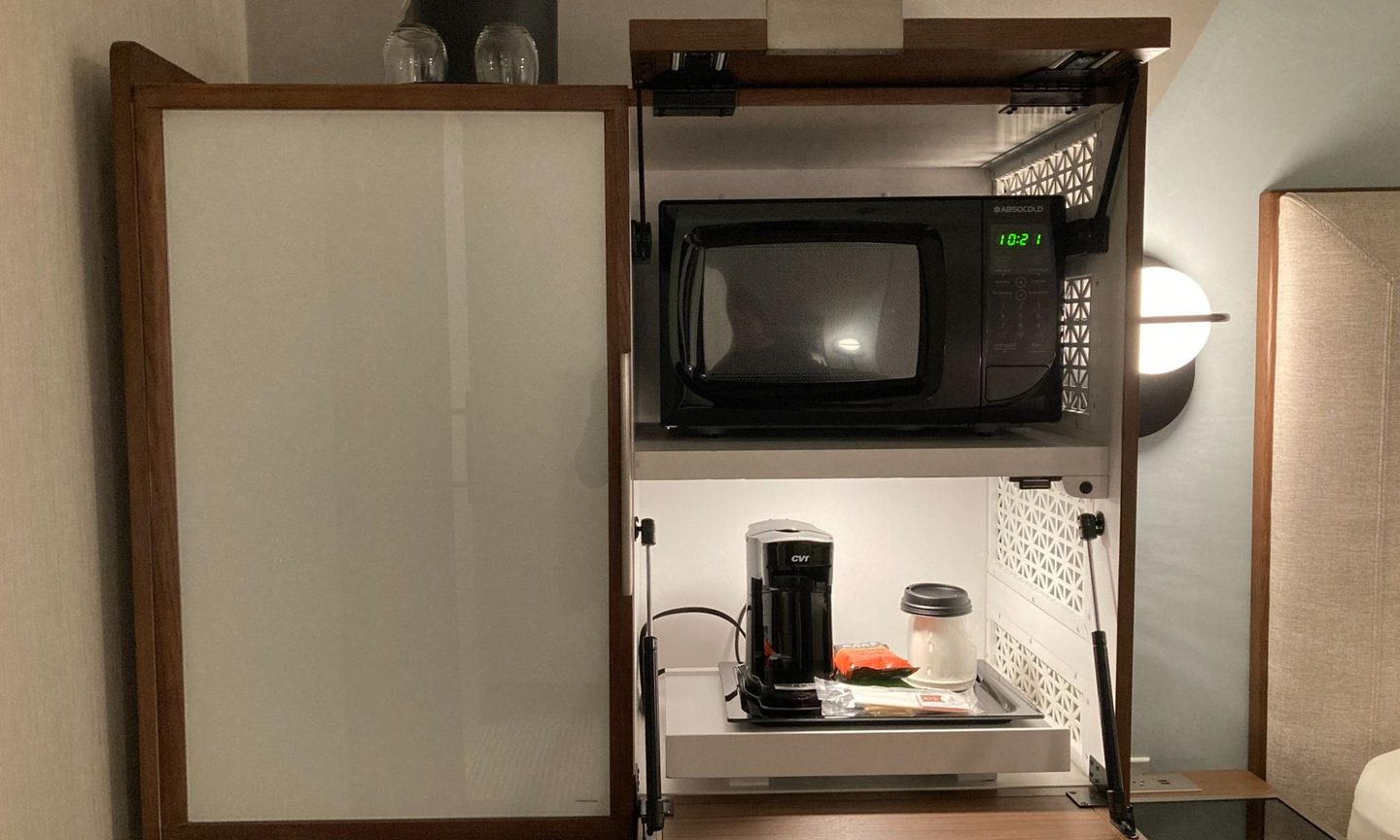 Space is used efficiently, as evidenced by features such as the stacked kitchenette that includes a microwave, coffee maker and mini fridge. Rooms also include flat-screen TVs and USB outlets.