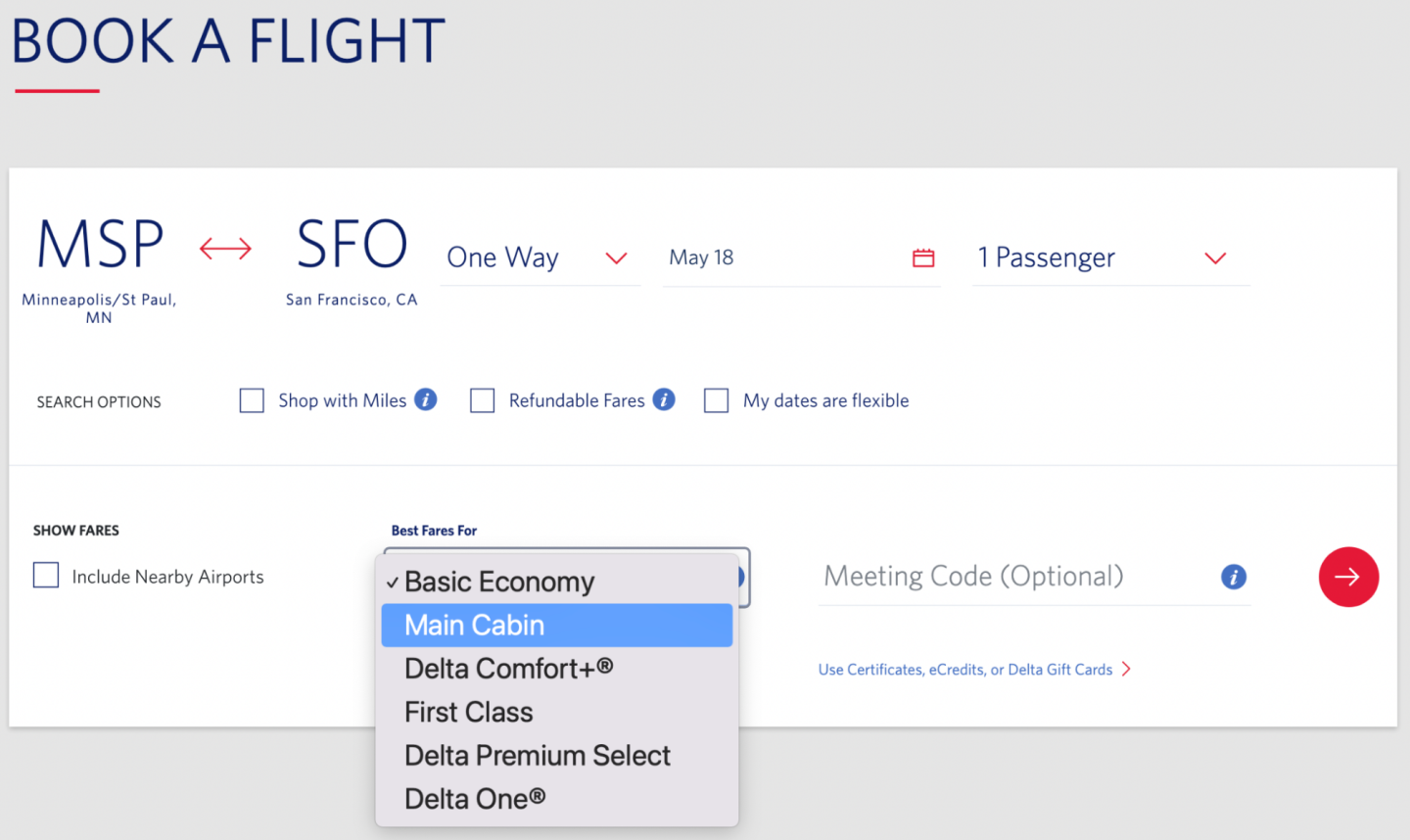 Booking a main cabin ticket is easy if you're starting your search on Delta.com. Simply select “Main Cabin” in the “Best Fares For” dropdown menu when you're searching for flights to see only main cabin and higher fare classes.