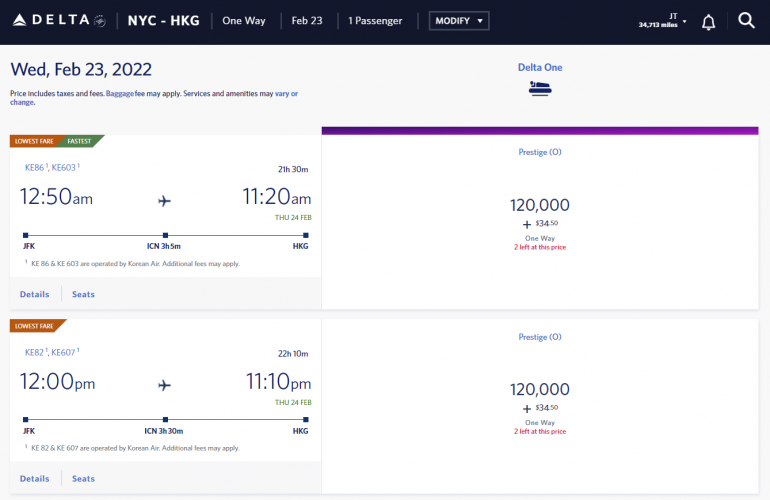 Comparatively, the cheapest Delta business class partner awards to Hong Kong cost 120,000 miles each way. And Delta now charges even higher rates within 60 days of departure.