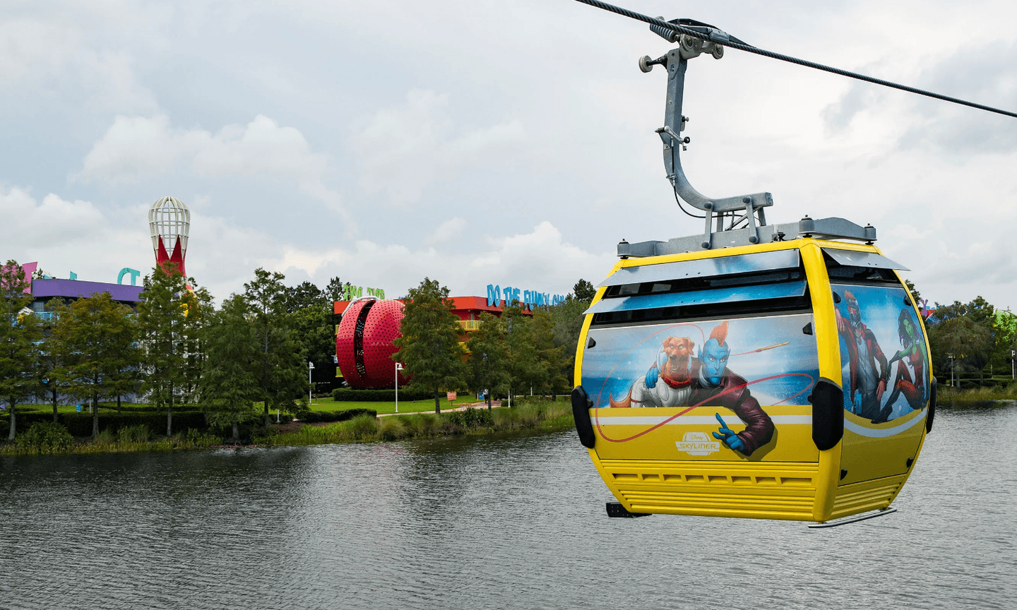 An aerial gondola vehicle from the Disney Skyliner glides in front of Disney’s Pop Century Resort. (Photo courtesy of Disney)