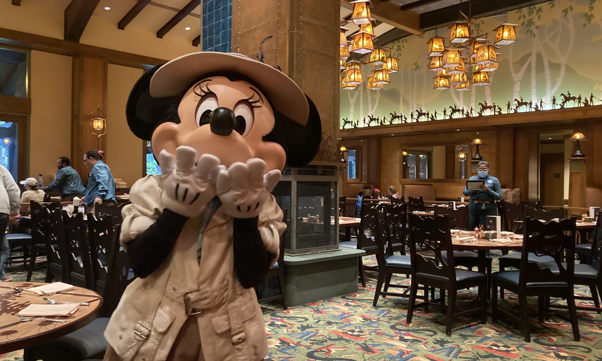 Over at Storyteller's Cafe, Mickey and his pals meet guests at their tables while wearing their wilderness explorer outfits.