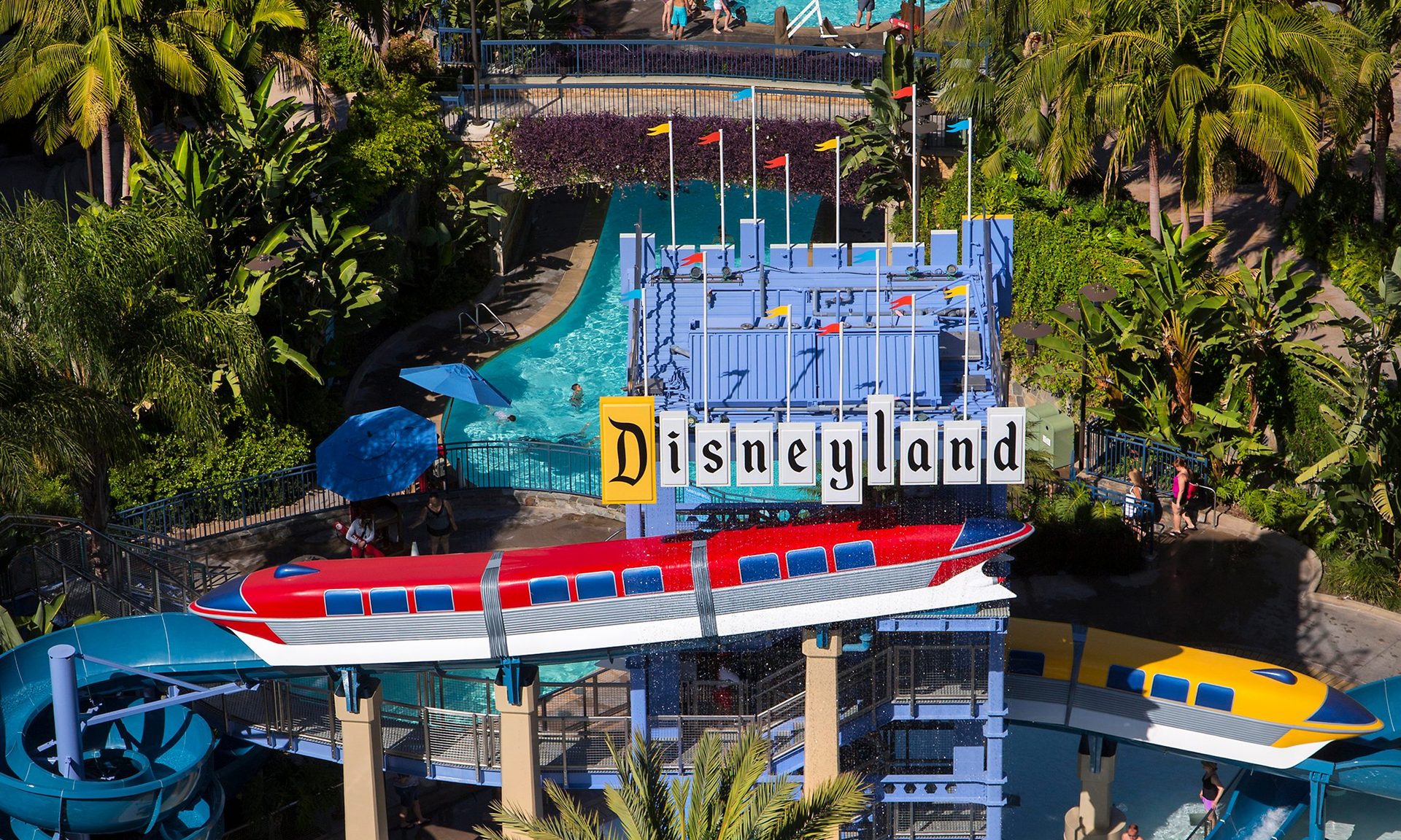 The Disneyland Hotel pool is themed around the iconic monorail. Featuring a twisting waterslide shaped like the monorail itself, a zero-entry pool, and a splash zone for younger guests, it's a water playground perfect for families seeking an active and playful pool experience.
