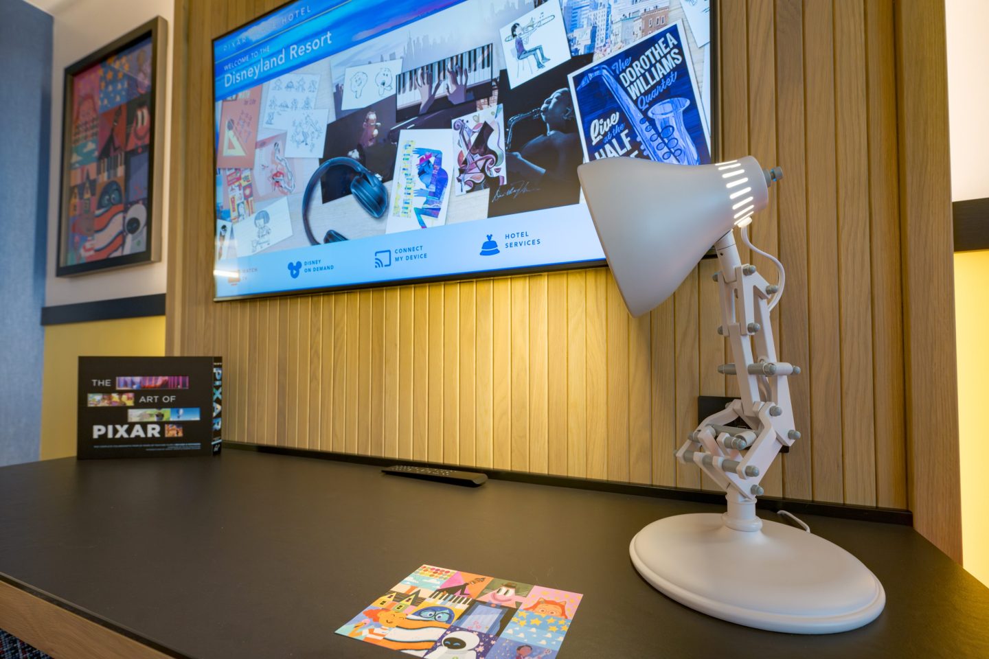 Next to the couch and opposite from the beds is a desk, TV, closet and minibar, as well as a mini version of the iconic Pixar lamp on the desk.