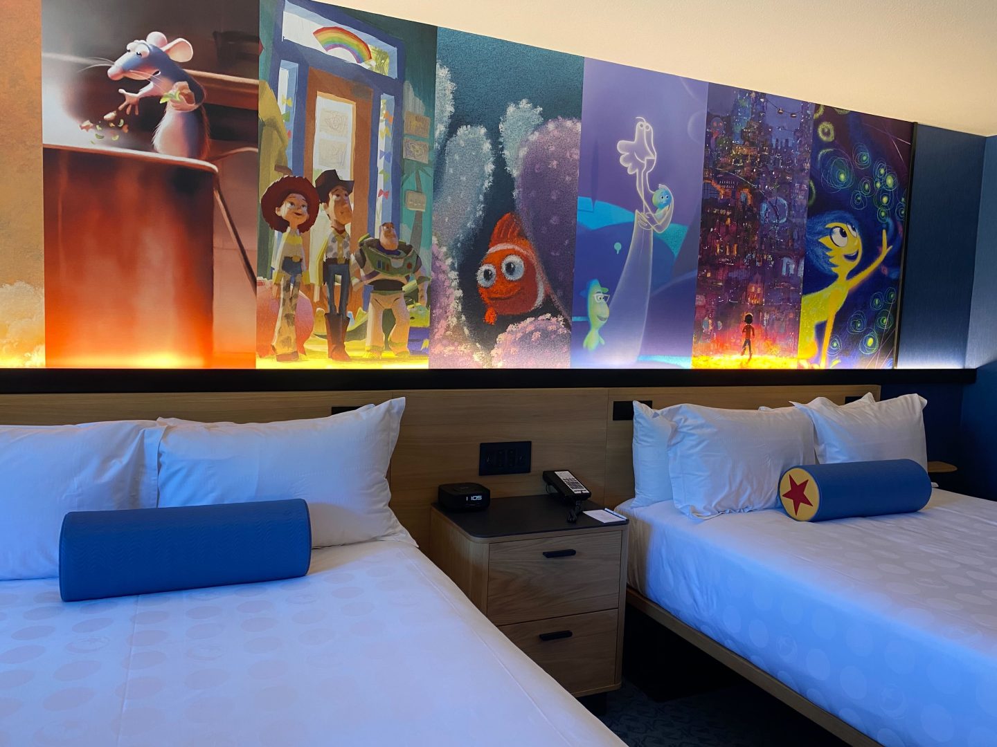 Pixar Place Hotel guest rooms are modern and colorful in a way that would appeal to both adults and children. They come in various sizes — and some even have their own unique themes.