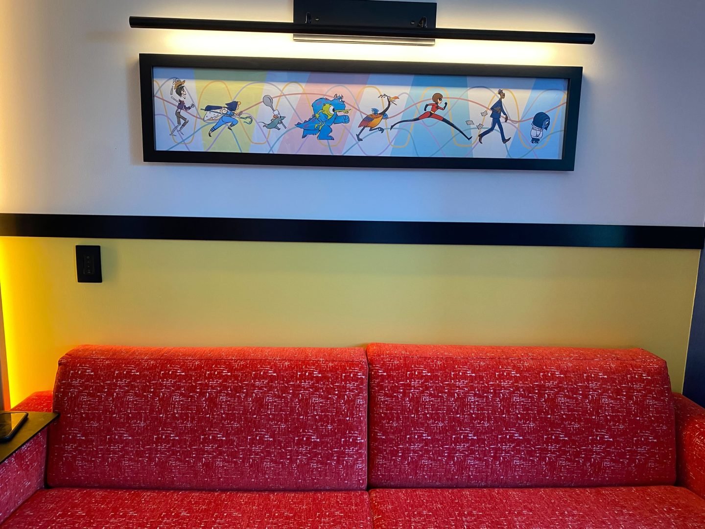 The focal point of each room is the mural of Pixar art above the bed. There are controls, too, to adjust the mood lighting behind the bed. The more subtle theming elements include a pattern of the Pixar lamp on the carpet (homage to a design used at Pixar’s Emeryville, California, headquarters) and the Pixar ball printed onto the bedsheets.