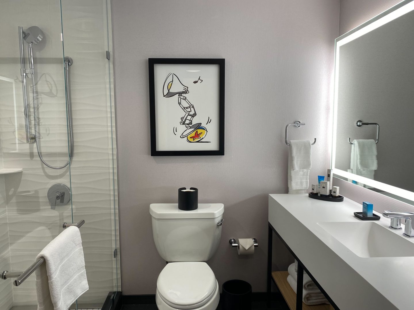 The relatively plain exterior of the hotel doesn’t do the rest of the hotel justice. Once you step inside the lobby, you’ll find modern finishes, tastefully curated artwork, some reimagined areas for play, and, of course, little details that will delight Disney enthusiasts.