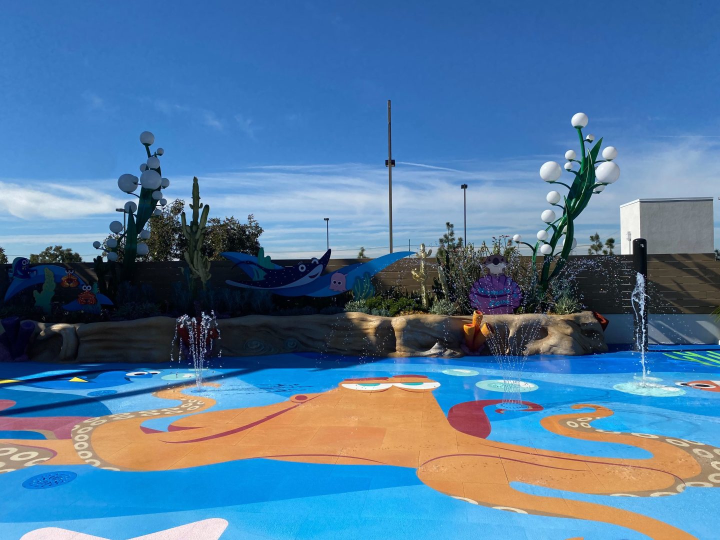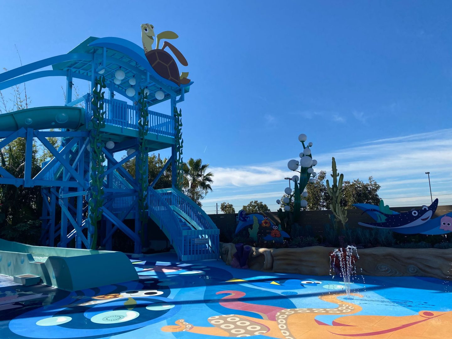 Right next to the pool is a splash pad that’s entirely “Finding Nemo” themed, complete with water jets, a succulent garden playing the part of a coral reef and custom seaweed light fixtures.