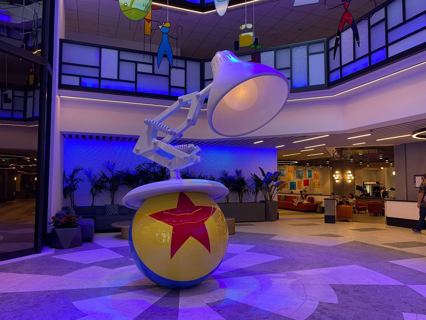 The Pixar Place Hotel lobby showcases Pixar’s animation process, starting from the simple, geometric shapes in the mobile above the lobby’s centerpiece. The larger-than-life lamp balancing on the Pixar ball is instantly recognizable when you walk through the front door.