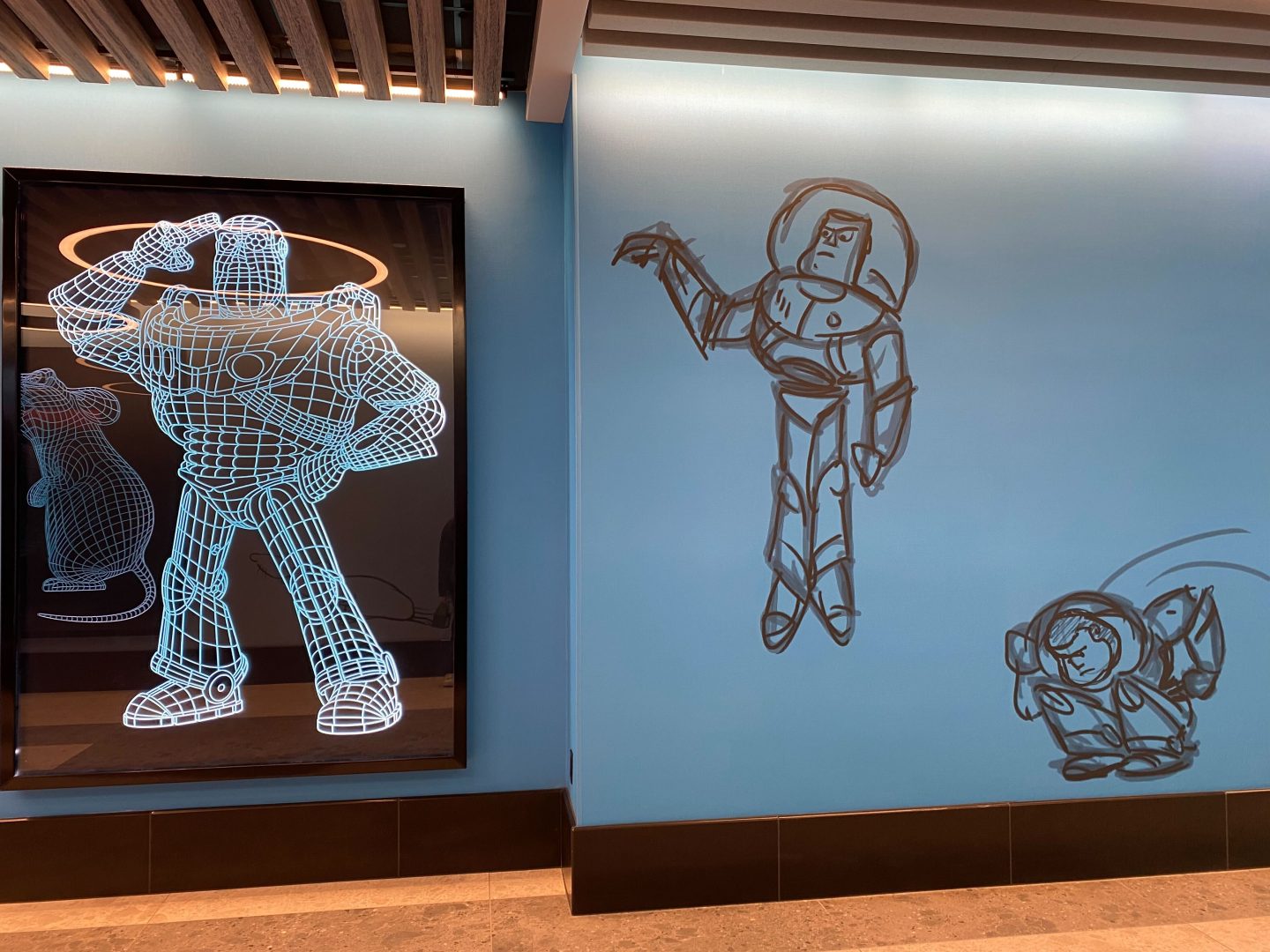 The lobby is also decorated with sketches of Pixar characters, showing how earlier depictions progress into computer wireframes. You’ll even find clay models and other concept art throughout the check-in area.