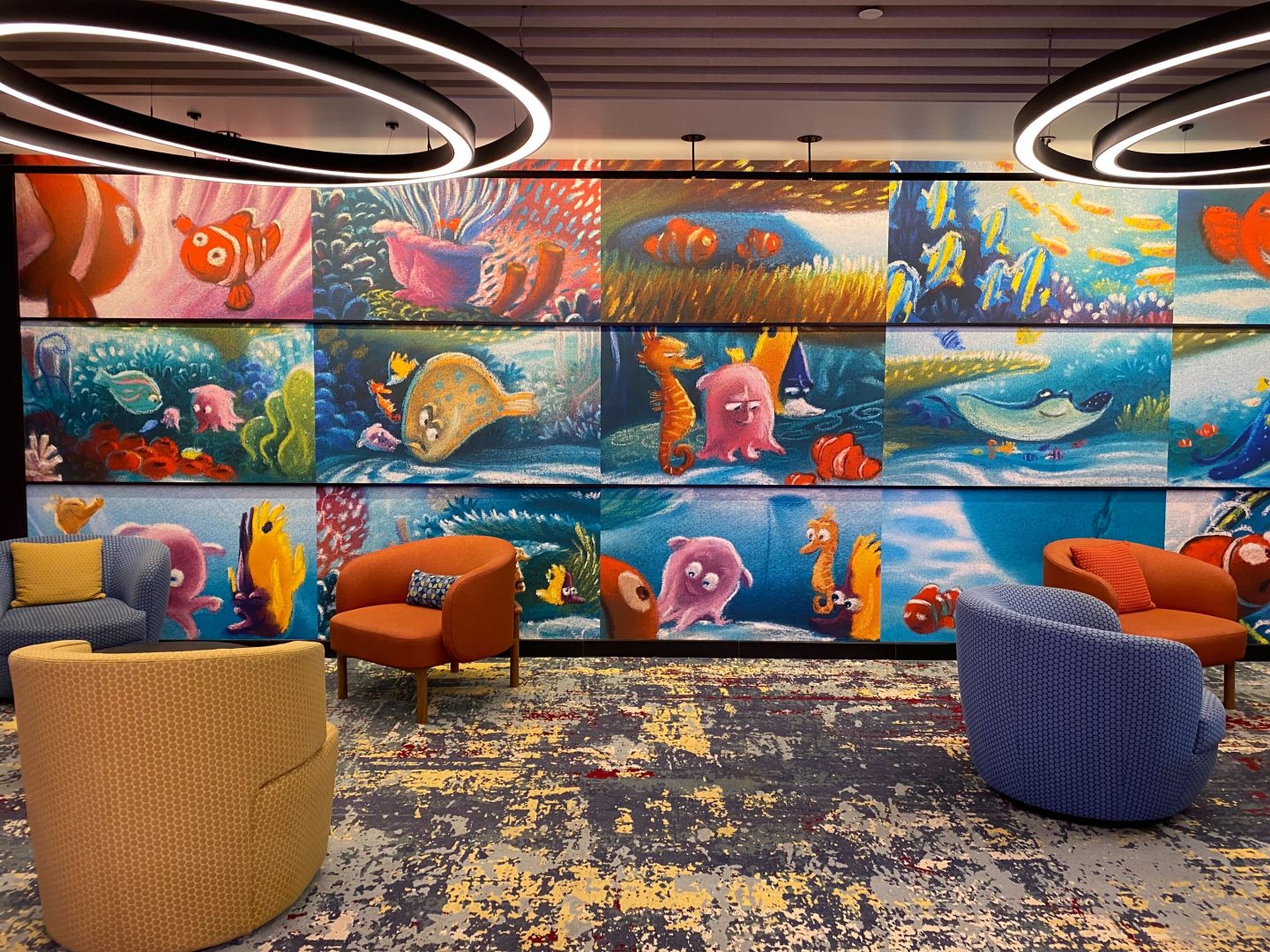 Kids will love finding the 16 character silhouettes embedded on tiles in the lobby.