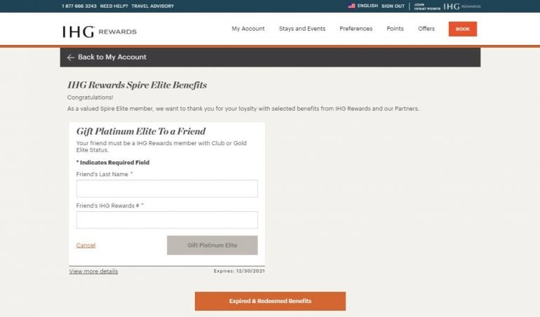 NerdWallet’s analysis pegs the value of IHG One Rewards points at 0.6 cent per point. At that rate, the 25,000 bonus points option is worth around $150. So, make sure a friend or family member will get at least this much value out of Platinum Elite status before opting for the elite status gifting option.