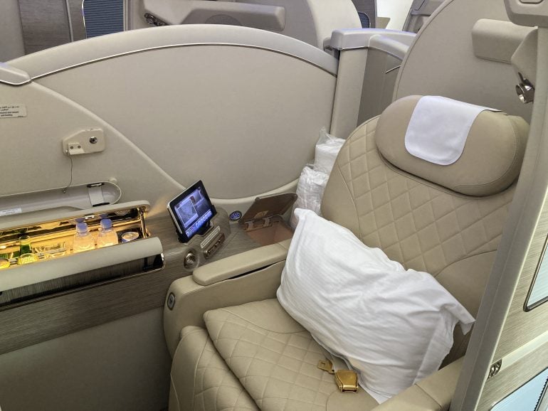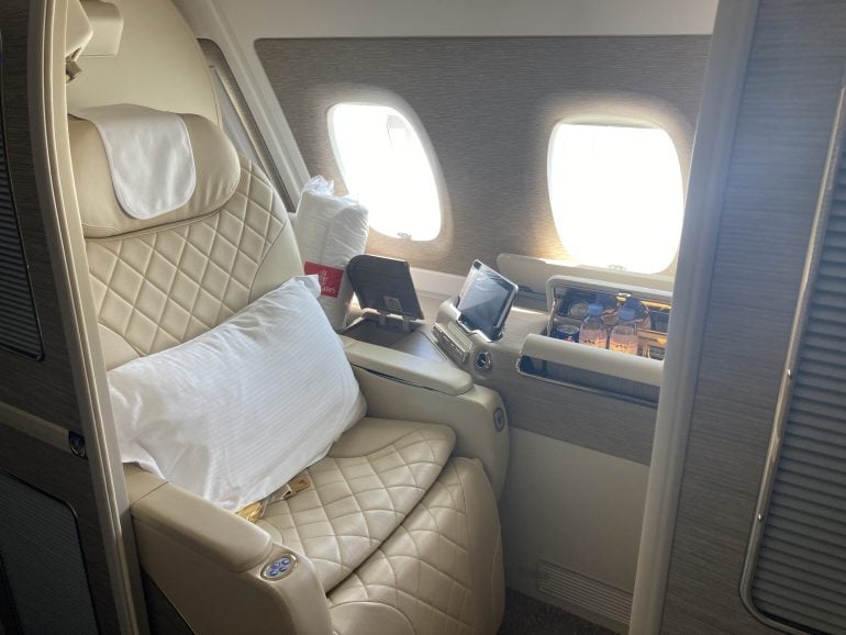 And you might be wise to check luggage. Keep in mind that, with Emirates first class, there's no overhead space to store your luggage (there's only a bit of space under your seat for something like a smaller bag).