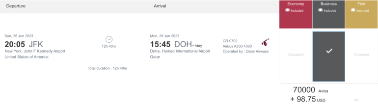 As far as mileage redemptions go, the program charges a reasonable number of miles and taxes on its flights. For example, a flight from New York-JFK to Doha in business class can cost 70,000 Avios plus $98.75.