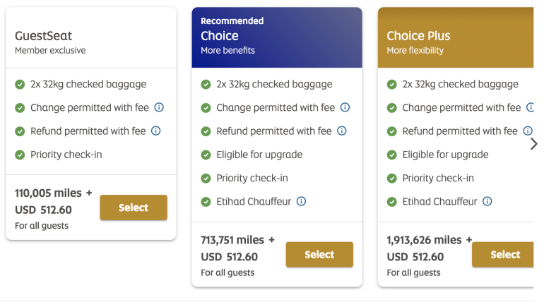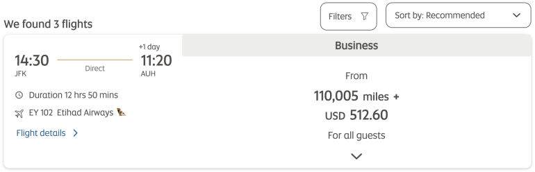 On the redemption side, a one-way flight in business class from New York-JFK to Abu Dhabi at the GuestSeat rate requires 110,005 miles plus $512.