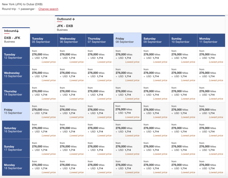 For example, a round-trip, business-class flight from New York-JFK to Dubai requires 276,000 Skywards miles plus an additional $1,700 in taxes, fees and carrier-imposed charges, which is on the high end.