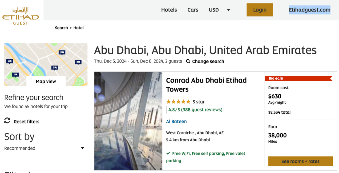 A three-night hotel stay in Abu Dhabi booked through Etihad’s hotel platform shows the number of Etihad miles you’d earn on a specific booking.