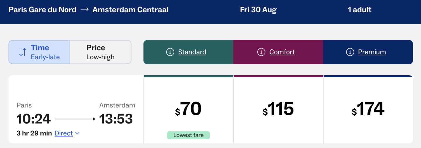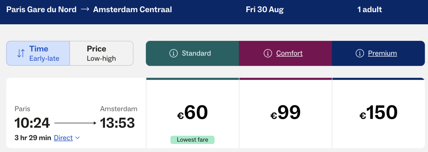 If the train company and an OTA offer tickets, compare prices to see where those seats are cheaper. We searched for a train from Paris to Amsterdam in August 2024 on the Eurostar site and on Trainline to see which option is cheaper.