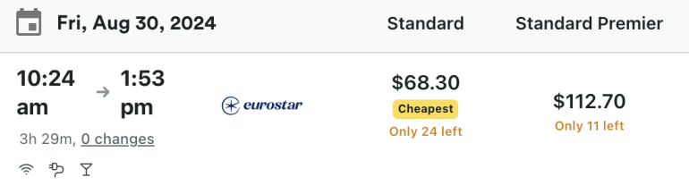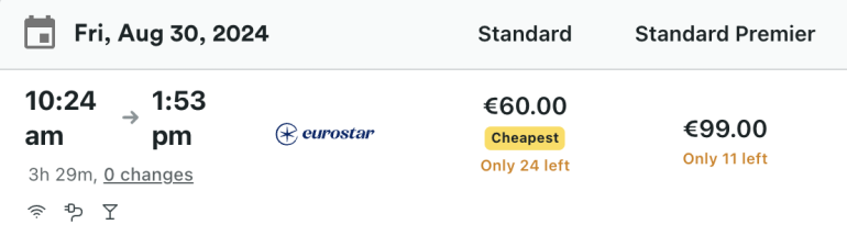 If you pay in euros, tickets on Eurostar and Trainline are the same price (60 euros). But if you pay in U.S. dollars, the fare is slightly cheaper on Trainline ($68.30 versus $70). If you don’t have a credit card that waives foreign transaction fees, you’d want to book the ticket from Trainline in U.S. dollars.