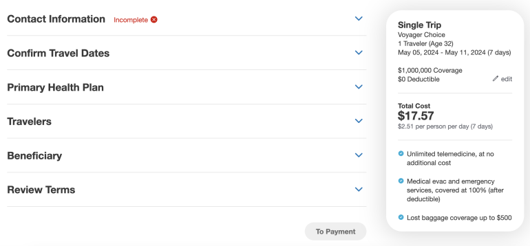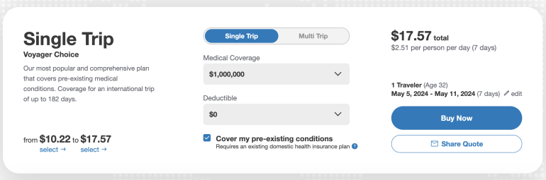 Once you hit "Get A Quote" the results page pops up, which will give you the option to choose your deductible amount and maximum level of coverage. You can also toggle between single trip and multi trip.