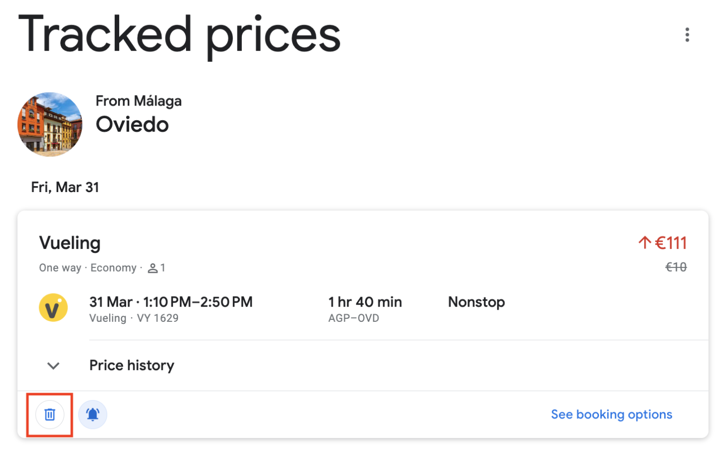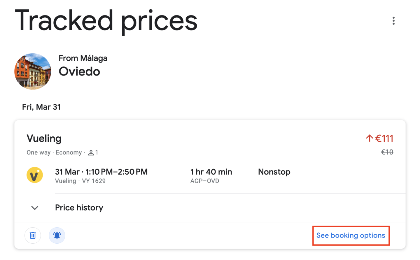 If the price has decreased and you're ready to book the flight, click "See booking options" and proceed with the reservation.