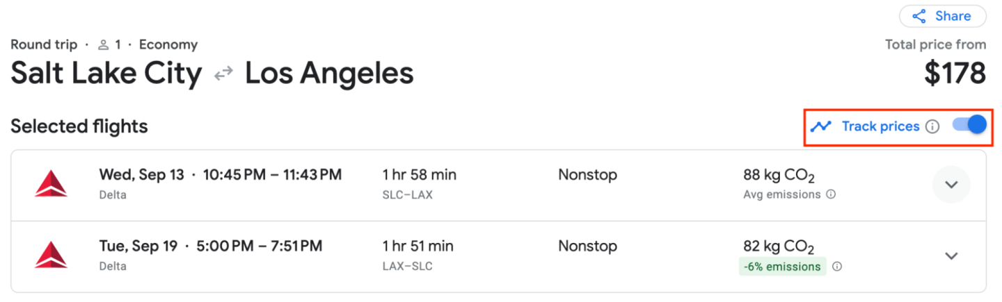 Google Flights trackers are best used when you've narrowed your flight options and have a specific route or flight time in mind. Setting these alerts with one click is easy and the flight tracking tool does all the work.