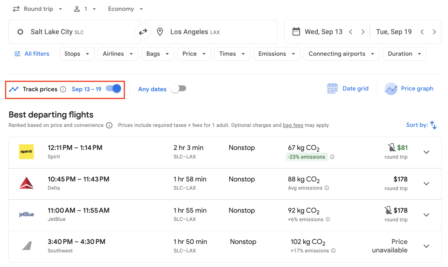 If you prefer just one or two specific departures, it's best to set trackers just for those flights to avoid seeing price changes for all flights that day.