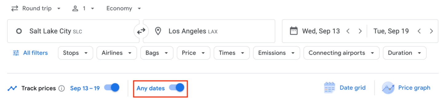 Additionally, if your dates are flexible, click on "Any dates." This will enable you to receive price change notifications for flights on specific days whenever prices on this route are low within a month of your chosen travel dates.