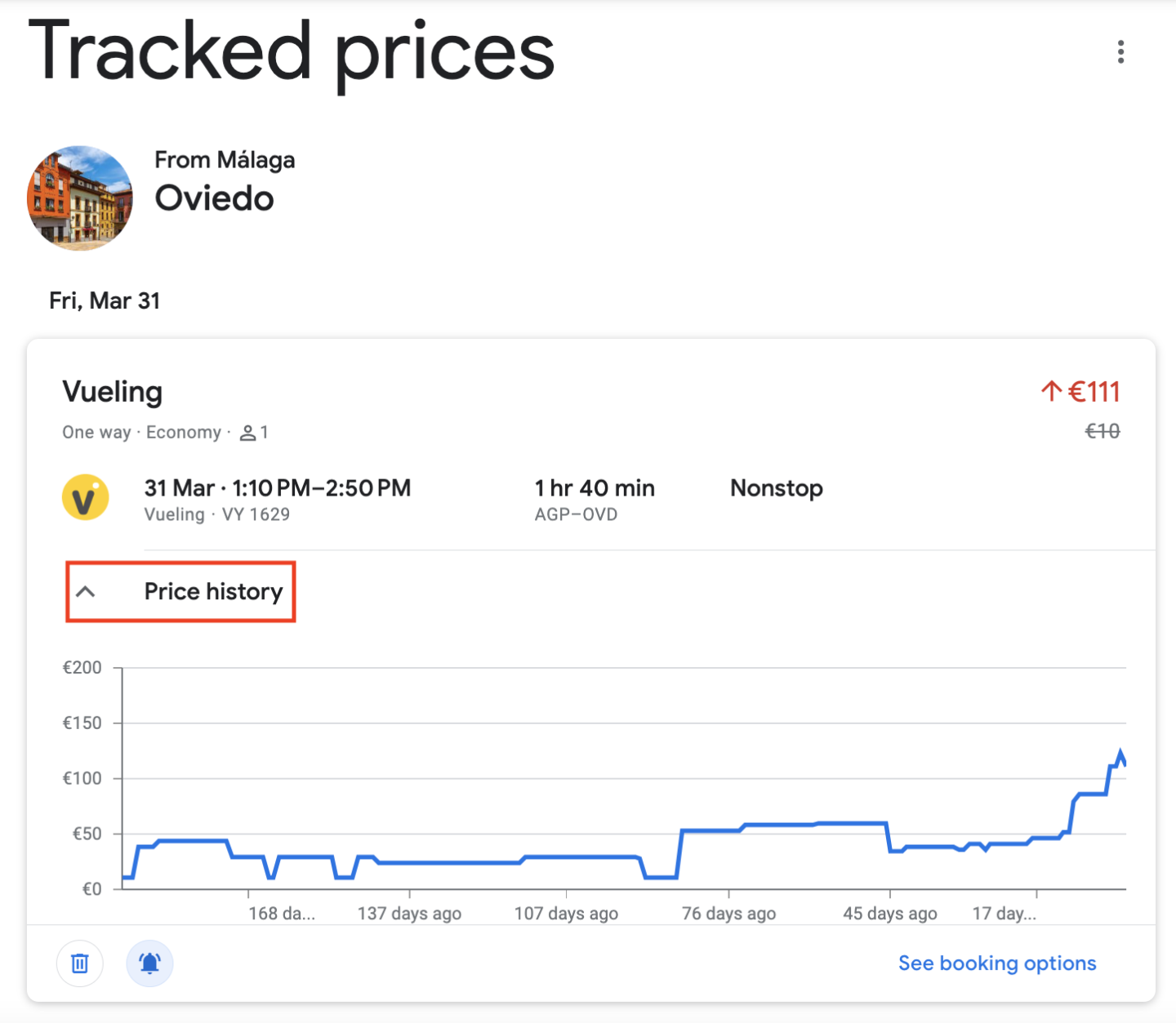 This is also where you can view a tracked flight's history and the price changes over the past several months, with increases and decreases shown in the graph.