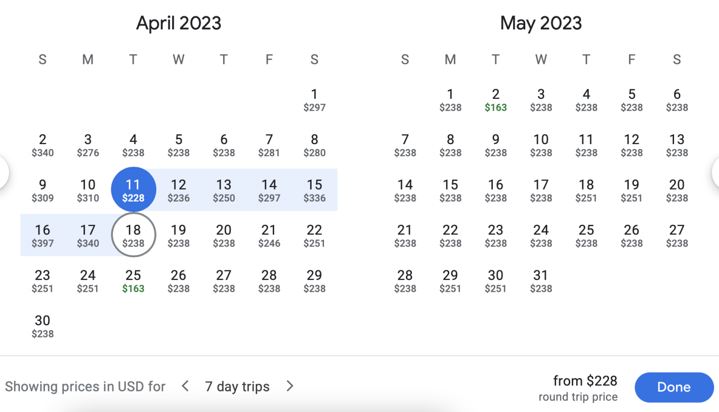 Google Flights displays ticket prices for a two-month window. If you have flexibility on your travel dates, it’s worth taking a look around to see when flights are the least expensive. Google even helps you out by highlighting the cheapest fares in green.