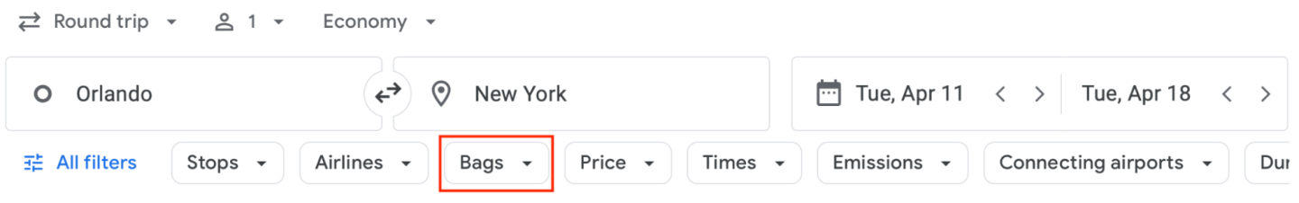 Whether you’re an overpacker or a light traveler, Google Flights gives you the option to choose how much luggage you’d like to bring.