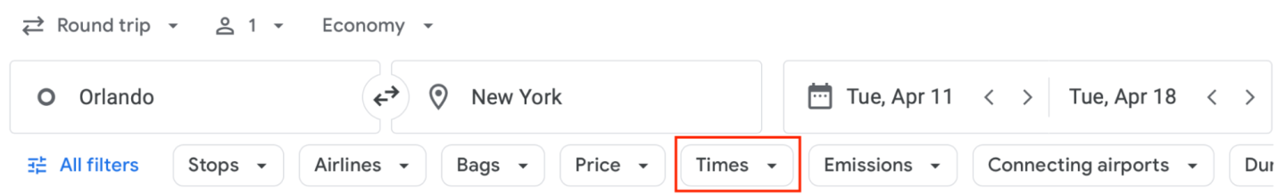 If you have an early-morning meeting or you’re looking to leave a little later, you’ll want to filter out the flights that don’t fit your needs. To do so, hit the “times” button on the search page.