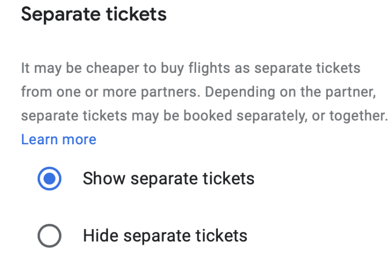 Allowing for separate tickets means that you may need to book two one-way flights rather than a round-trip flight, though Google will only highlight these results if they’re cheaper than a single-ticket itinerary.