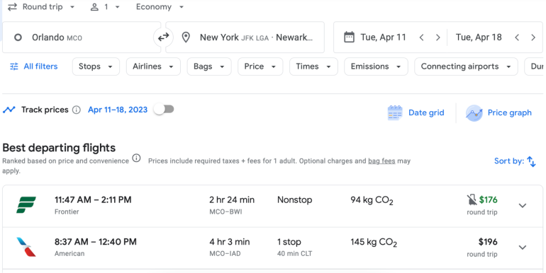 On the surface, Google Flights seems pretty simple to use — and it is. Anyone can navigate to the site, input their search information and receive results. For example, we used Google Flights to search for a round-trip ticket in economy class from Orlando to New York. But you can also search for one-way or multi-city itineraries on Google Flights, as well as business class tickets.