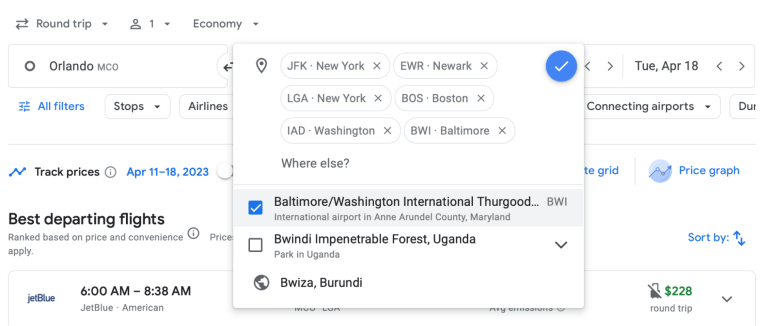 In this case, adding multiple airports allowed us to find a flight for $176 rather than the $228 in the original search.
